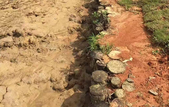 改造魚塘,堤壩用木樁加固為了穩(wěn)定壩的基礎(chǔ),兩邊用松木樁固定;相對來說木樁成本較低。